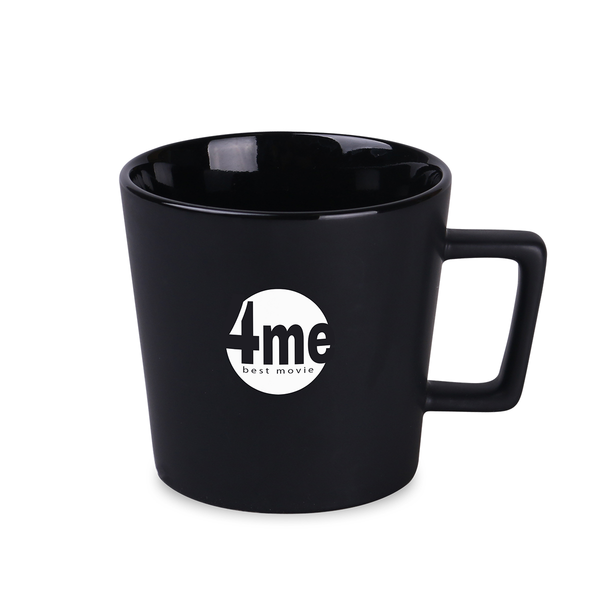 Moderner Becher mit schwarzer matter Oberfläche. Er verfügt über einen Griff mit einer interessanten, designerhaften Form.