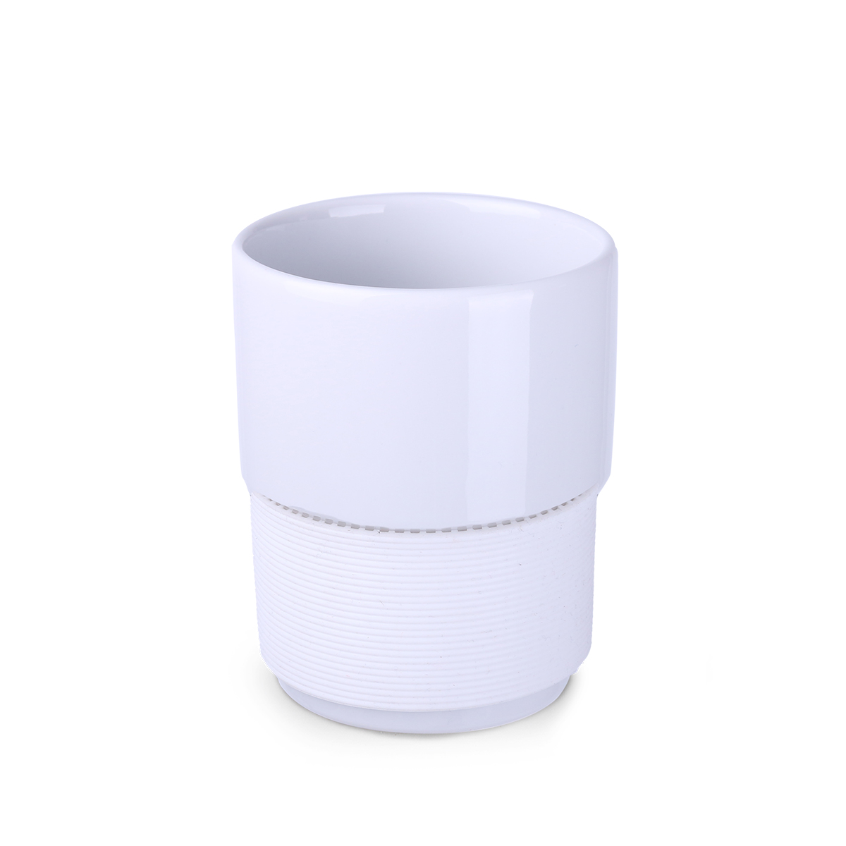 Mittelgroßer Werbebecher aus Keramik ohne Henkel. 40 mm breite Bänder, erhältlich in 7 Farben: weiß, orange, rot, grün, marineblau, braun und schwarz.