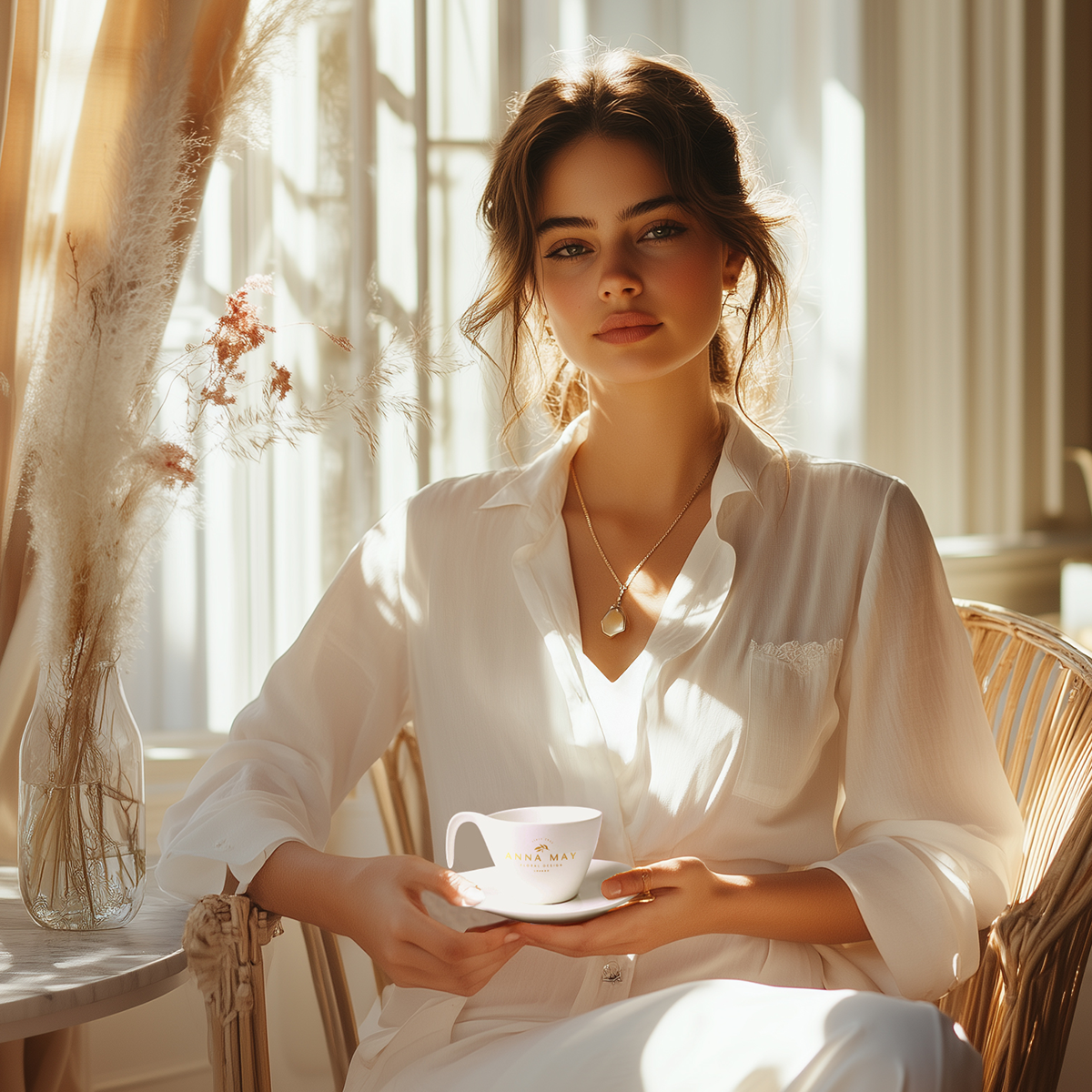 Tasse mit Untertasse aus Porzellan Royal White, Durchmesser d. Untertasse 177 mm