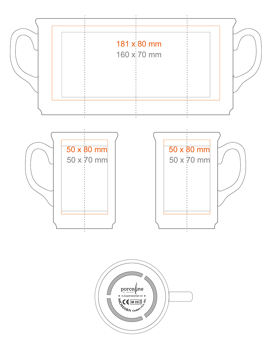 Auf dem Tassengriff (40x6 mm) Auf der Innenwand (40x20 mm) Goldaufdruck Silberaufdruck Druck über den Rand Handarbeit - Einfärbung des Randes Personalisierung |